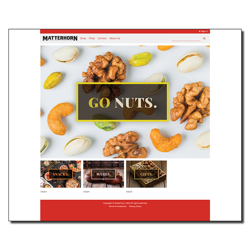 Matterhorn is the best of both worlds! The home page features brilliant large imagery while the subpages offer an easy to navigate sidebar menu with quick access to all of your product categories. A slim-line header and footer bring a pop of your brand color throughout the site.